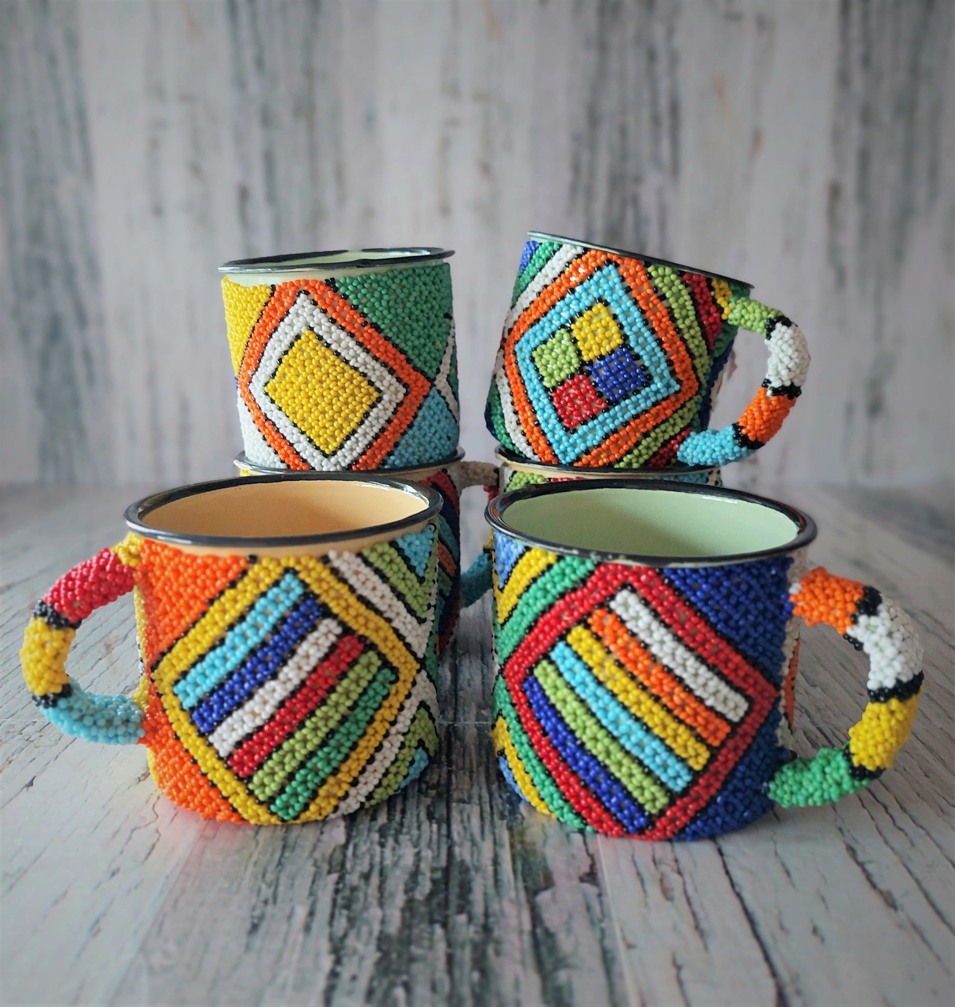 Traditional patterns beaded around enamel mugs. Accessorize your home with the African flare and stand out from the crowd!